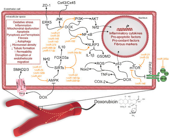 Thus, DOX, by affecting and altering the expression of microRNAs, leads to the initiation of apoptosis, ferroptosis, pyroptosis, ER stress, and the disruption of mitochondrial biogenesis, thereby causing the death of endothelial and myocardial cells.