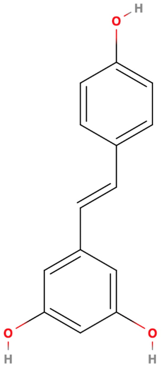 Resveratrol (3,5,4′-trihydroxy-trans-stilbene) is a stilbenoid, with a molecular weight of 228.2 g/mol and a melting point of 253–255 °C [7,28,29,30,31]. Its chemical structure consists of two aromatic rings (phenol groups) linked by a styrene double bond [30,31,32] (Figure 1).