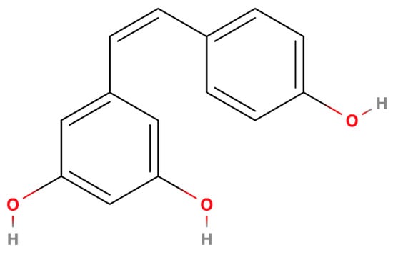 Resveratrol exists as two primary isomers, trans-resveratrol and cis-resveratrol, distinguished by the spatial arrangement of functional groups around the molecule’s double bond [28,30,31,32,33]. Trans-resveratrol (Figure 1) is the more stable and biologically active form, exhibiting greater efficacy in terms of antioxidant, anti-inflammatory, and neuroprotective properties [7,28,31,32]. This enhanced activity is attributed to its favorable configuration for interacting with biological targets. Cis-resveratrol (Figure 2), while less common, can be generated from trans-resveratrol through exposure to light or heat [28,31,32]. However, its biological activity is less pronounced compared to the trans isomer.