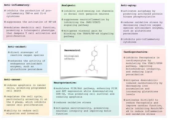 - Analgesic properties [92,93,94,95,96,97,98]: Resveratrol demonstrates analgesic properties through several mechanisms. It inhibits acid-sensing ion channels in dorsal root ganglion neurons, reducing acid-induced pain [93]. Resveratrol also suppresses neuroinflammation by inhibiting the JAK2/STAT3 signaling pathway, thereby decreasing pro-inflammatory cytokines like TNF-α (tumor necrosis factor α) and IL-6 (interleukin 6) in spinal cord injury models, which contributes to alleviating mechanical allodynia [98]. Furthermore, it mitigates visceral pain by blocking the TRAF6/NF-κB signaling pathway, a key player in inflammatory pain [95].