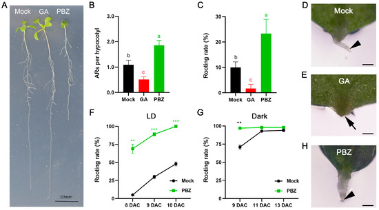 Effects of GA and PBZ treatments on rooting rate of AR formation from hypocotyls and DNRR. (A,B) AR formation from hypocotyls. (A) Rooting phenotype of Col-0 seedlings under mock, GA, and PBZ treatments. Scale bar = 10 mm. (B) ARs per hypocotyls (Col-0) under mock, GA, and PBZ treatments 7 days after shift from dark to LD, 10 DAG. (C–H) DNRR from Col-0 explants under mock, GA, and PBZ treatments (LD and dark conditions). (C) Rooting rate of Col-0 leaf explants under mock, GA, and PBZ treatments 9 DAC (LD). (D,E,H) Phenotype of Col-0 leaf explants under mock, GA, and PBZ treatments 9 DAC (LD). Arrow indicates the absence of an AR (E). Note that roots are thicker after PBZ treatment in comparison to mock treatment (arrow heads in (D,H)). Photos were taken using Nikon (SMZ25) microscope. Scale bar = 500 µm. (G) Dark conditions accelerate rooting additive to PBZ treatment. (B,C,F,G) Average values are shown, ± SEM. Color letters ((B,C); One way ANOVA, p < 0.05) and asterisks ((F,G); Student’s t-test: ** p < 0.01; *** p < 0.001) indicate significant changes.