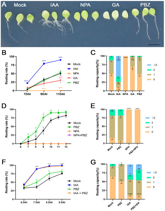 Effects of different hormone treatments on rooting rate (time courses) and rooting capacity in wild-type (Col-0) leaf explants in darkness. (A–C) Single treatments with IAA, NPA, GA, and PBZ. (A) Rooting phenotype of Col-0 leaf explants. Scale bar = 10 mm. (B) Rooting rate. (C) Rooting capacity. Note that rooting capacity was decreased by PBZ, while IAA treatment increased rooting rate and rooting capacity. (D,E) Treatments with NPA, PBZ, and NPA+PBZ. Note that rooting is completely abolished by NPA treatment even in presence of PBZ, indicating that polar auxin transport is essential for accelerating effects of PBZ on DNRR. (F,G) Treatments with IAA, PBZ, and IAA + PBZ. Note that accelerating effects on rooting rates by IAA is epistatic to PBZ treatment (no additive effect), but PBZ significantly reduced rooting capacity even in presence of IAA. Treatments: 0.1 µM IAA, 1 µM NPA, 1 µM GA, and 5 µM PBZ. (B–G) Average values are shown, ± SEM. Asterisks indicate significant changes (Student’s t-test: * p < 0.05; ** p < 0.01; *** p < 0.001).