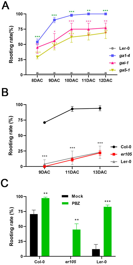 Reanalysis of GA biosynthesis and GA signaling mutants reveals (i) negative effects of GA and (ii) positive effects of ER signaling on DNRR in darkness. (A) Rooting rate time course: rooting rate of three GA mutants, ga1-4, ga5-1, and gai-1, are significantly higher than those in wild type (Ler-0). (B) Rooting rate time course: in comparison to wild-type Col-0, rooting was almost abolished in leaf explants of both er-1 (Ler-0) and er-105 (Col-0) mutants. (C) Treatment with 5 µM PBZ can recue low rooting rates of both er-1 (Ler-0) and er-105 (Col-0) mutants (9 DAC). (A–C) Average values are shown, ± SEM. Asterisks indicate significant changes (Student’s t-test: * p < 0.05; ** p < 0.01; *** p < 0.001).