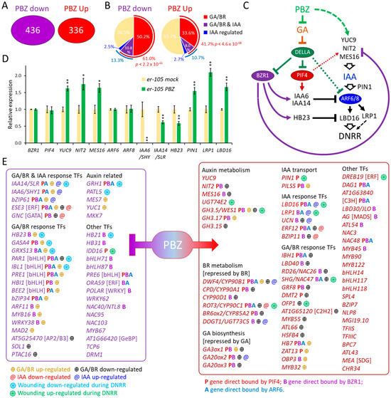 Expression changes in response to PBZ treatment 24 HAC. (A) Number of genes with significantly decreased (down) and increased (up) expression rates. (B) Percentage of GA/BR- and auxin-regulated genes and their overlaps. (C) Conceptional model of potential pathways explaining how PBZ could increase LBD16 expression. Dotted lines represent known interactions that seem to be covered during DNRR with PBZ. Broken lines represent putative, probable indirect interactions. Note that most arrows indicate transcriptional regulation, but DELLA proteins bind directly to BZR1, PIF, and ARF6 proteins, PBZ blocks GA synthesis, and PIN1 is auxin (IAA) transporter. (D) Expression changes in response to PBZ treatment (24 HAC) of genes that can theoretically increase LBD16 and LRP1 expression levels. Relative expression in PBZ-treated er-105 leaf explants compared to mock treatment using CPM values in Supplementary Tables S1 and S2; ±SEM; n = 4. Asterisks indicate significant changes (Student’s t-test: * p < 0.05; ** p < 0.01). (E) Selection of genes with significantly decreased (down-regulated) and increased (up-regulated) expression rates. Regulation by GA/BR, IAA, and/or wounding as well as promoter binding by PIF4, BZR1, and/or ARF6 is indicated.