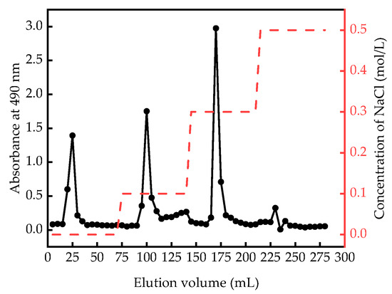 The crude polysaccharides were purified using a DEAE-52 cellulose column. The purification sequence was as follows: first, the crude polysaccharides were decolorized using the hydrogen peroxide decolorization method and then, they were deproteinized using Savage reagent (chloroform-to-n-butanol volume ratio of 4:1). After evaporation and concentration, the decolorized, deproteinized polysaccharides were obtained. After dissolving the polysaccharides, they were dialyzed using a dialysis bag for 48 h to remove excess reagents. After evaporation, concentration, and drying, the polysaccharides to be loaded onto the column were obtained.