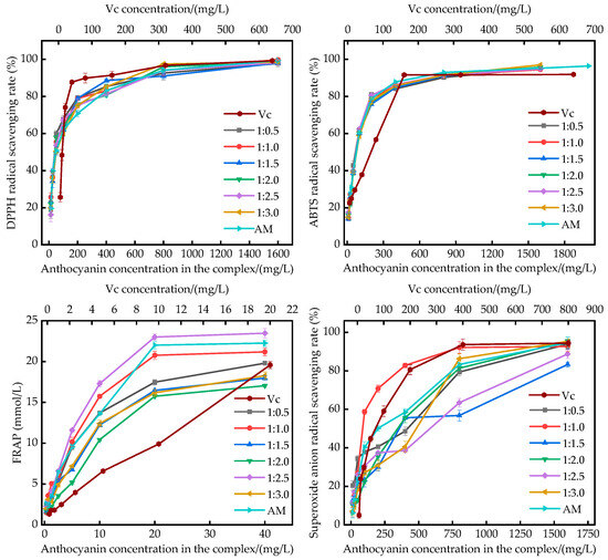 The mass concentration of anthocyanins was maintained at 4 mg/mL at pH 3.0, and the concentration of polysaccharides was varied to determine the scavenging ability of each sample against the DPPH radical and ABTS radical, its ferric ion reduction, and the scavenging ability against superoxide anion radicals. The scavenging ability was determined using Vc as a positive control.