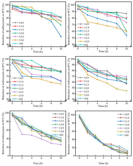 At a temperature of 70 °C, the retention in the complexes decreased to approximately 40% after 10 h, whereas at 90 °C, this process was completed in only 2 h. After 6 h, the retention was below 20% in all cases. The 90 °C water bath environment was observed to degrade the anthocyanins at a more rapid rate than that observed at 70 °C. The anthocyanin retention of the anthocyanin solution without added polysaccharide was 24.54 ± 0.50% after 4 h at 90 °C. For the samples with ratios of anthocyanins to polysaccharides of 1:0.5, 1:1.0, 1:1.5, 1:2.0, 1:2.5, after 4 h at 90 °C, the retention rates were 17.53 ± 0.53%, 28.88 ± 1.63%, 17.93 ± 0.33%, 20.52 ± 0.68%, 16.72 ± 1.15%, and 19.82 ± 1.12%, respectively. The interaction between anthocyanins and polysaccharides has been demonstrated to enhance the thermal stability of anthocyanins to a certain extent. However, the degradation of anthocyanin–polysaccharide complexes still occurs at high temperatures. This is attributed to the inherent instability of polysaccharides at elevated temperatures, which reduces their protective effect [