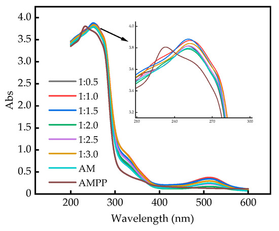 66]. Dissolve the anthocyanin powder (4 mg/mL) in a buffer solution and mix it with the polysaccharides in different proportions to achieve varying polysaccharide concentrations. The mass ratios of anthocyanins to polysaccharides were 1:0.5, 1:1.0, 1:1.5, 1:2.0, 1:2.5, and 1:3.0. The dispersion of anthocyanins and polysaccharides should be achieved through magnetic stirring, after which the mixture should be stored at 4 °C to prevent light exposure. The resulting compound, AM-AMPP (anthocyanin–polysaccharide complex from