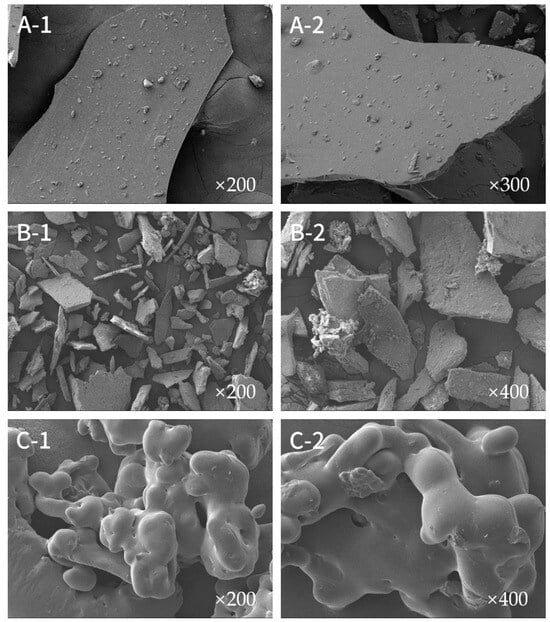 Figure 8(B-1,B-2), the polysaccharides exhibited a lamellar structure with varying dimensions and dispersed configurations, accompanied by the presence of irregular particles. At 400× magnification, the rough surface was observed to be more rugged, with the presence of debris. The observation of a porous and flocculent structure in some of the granular objects indicated the potential for repulsive forces between the polysaccharide molecules, suggesting that the intermolecular forces of attraction might be relatively weak [