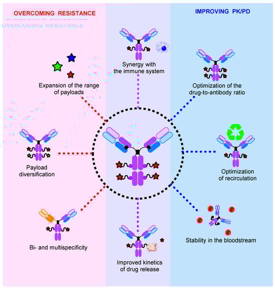 The most prominent trends in ADC development in recent years can be divided into two broad groups: overcoming resistance [3] and improving the pharmacological properties (Figure 1) [4]. The first group includes the expansion of the range of drugs used; their diversification [5,6,7,8], including the involvement of drugs with a new mechanism of action [9]; the use of bi- and multispecific antibodies [10]; and the multi-payload approach [11]. The second group may include the optimization of antibody recirculation in the body and the drug–antibody ratio (DAR), increased stability in the bloodstream, and improved drug release kinetics and synergistic interaction with the immune system [12]. All of these goals can be achieved by optimizing the key parts of the conjugate (Figure 2).