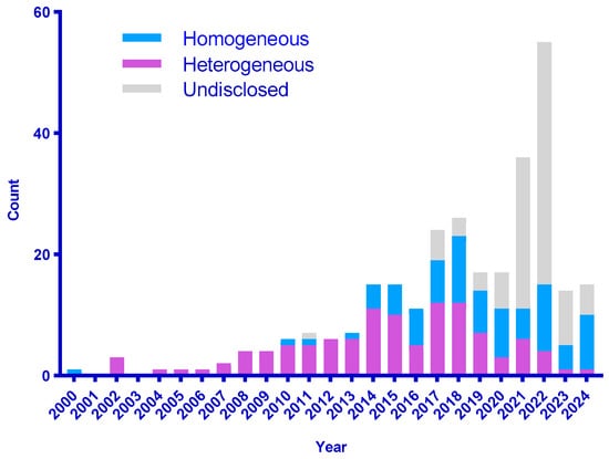 The development of homogeneous conjugates with a precisely defined drug–antibody ratio is a prominent trend in ADC development [14,15]. From around the 2010s to the present day, the percentage of homogeneous conjugates among those entering clinical trials has steadily increased, reaching more than 50% in the last two years, 2023–2024 (Figure 3) [16].