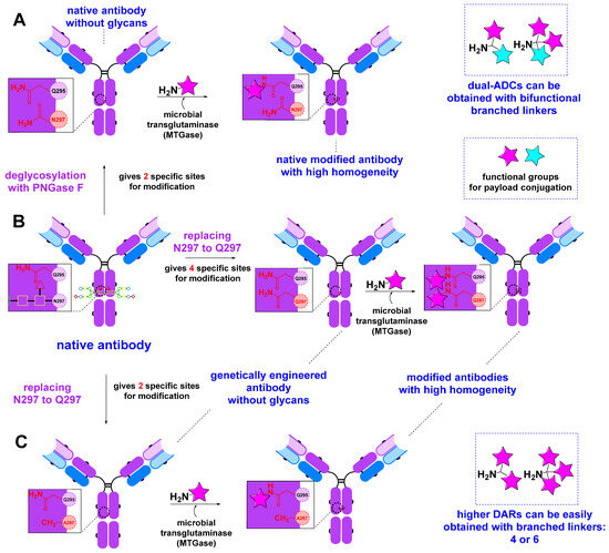 The advantages of this method are its low cost, versatility, high site-specificity, and the homogeneity of the products obtained, which, in turn, leads to improved pharmacological properties. The method is based on enzymatic recognition and ligation of a substrate to a specific site on the antibody. In the case of microbial transglutaminase, this is the glutamine 295 (Q295) residue on the Fc fragment of the antibody. It is normally inaccessible due to shielding by the glycans attached to the neighboring asparagine 297 residue (N297). The glycans can be removed by another enzyme, PNGase F (Figure 4A), or by sequence engineering to replace N297 with an A297 residue (Figure 4C). Without the involvement of genetic engineering, it is possible to obtain a conjugate with a maximum DAR of two, because the antibody has two Q295 sites. To increase the DAR, it is possible to use branched linkers (Figure 4A,C) or to introduce additional sites by engineering the antibody (Figure 4B).