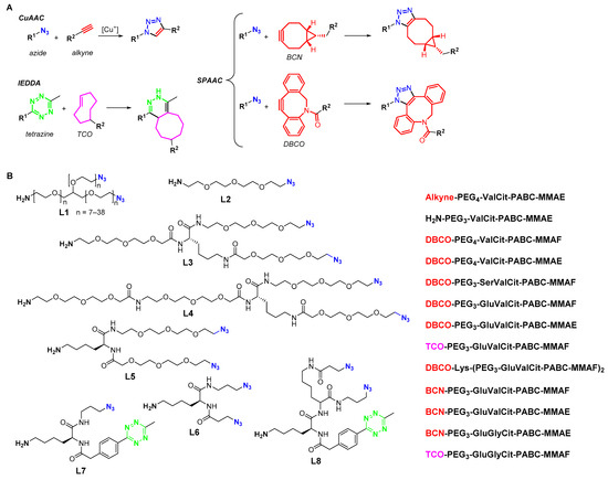 (A) Bioorthogonal click reactions; (B) functional amino-linkers used for MTGase-mediated antibody modification (L1–L8) and functional payload derivatives. For full structures, see Figure S1 in the Supplementary Materials.