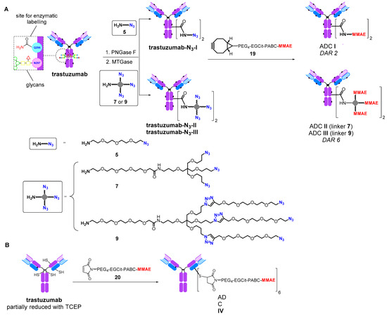 The synthesis of ADCs I–III (A) and ADC IV (B).