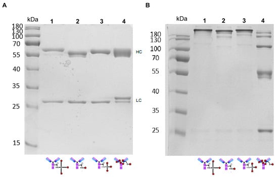 SDS-PAGE of conjugates. (A) Reducing conditions; (B) non-reducing conditions. Lane; 1—ADC III; 2—ADC I; 3—ADC II; 4—ADC IV. Conjugates in the figure caption are presented in native form for clarity.