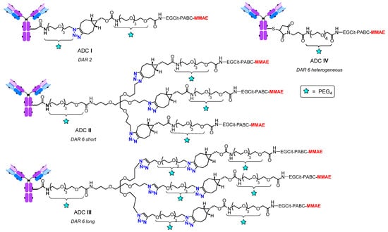 ADCs I–IV. Full structures of the branched linker parts are shown.