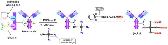 Direct MTGase-mediated modification of an antibody with an amino payload derivative, H2N-PEG3-ValCit-PABC-MMAE, has been reported [25]. However, the strategy of enzymatically assembling the conjugate in a single step has found limited use because MTGase-mediated conjugation requires a large excess of the linker (200–400 equivalents), making the use of a pre-assembled linker-payload rather expensive; in addition, payload solubility issues may arise.
