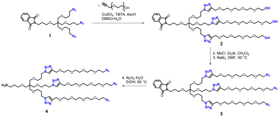 To this end, we extended the previously reported triazide 1 [35] with tetraethylene glycol monopropargyl ether using copper-catalyzed azide-alkyne cycloaddition (CuAAC) to obtain triol 2. Notably, the use of the CuSO4-TBTA-ascorbic acid combination, as opposed to the more conventional CuI [36], allowed for facile separation of the copper catalyst and isolation of the pure product. Following a two-step mesylation/azidation procedure, the extended triazide 3 was isolated; subsequent phthalimide deprotection yielded amino triazide 4 (Scheme 2).