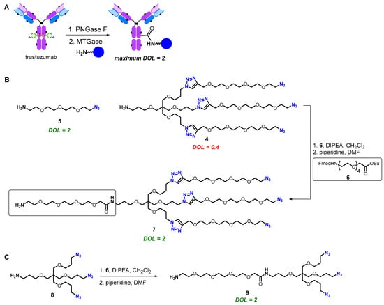 General scheme of MTGase-mediated conjugation (A); Synthesis of amino-PEG4-triazide linkers 7 (B) and 9 (C). DOL—degree of labeling.
