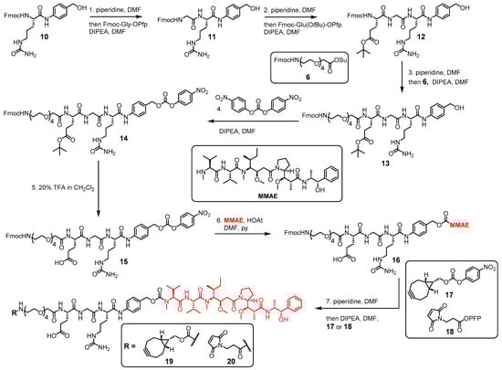 The shorter linker, 9, had the optimal amino spacer length for the reaction with MTGase that we had previously determined (Scheme 3B) and shorter (by one PEG4 unit) azido spacers for subsequent click reaction with the MMAE-containing moiety 19.