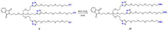 In a 100 mL round-bottom flask, triol 2 (2.19 g, 1.72 mmol, 1 equiv.) was dissolved in DCM (30 mL) and cooled to 0 °C (ice bath), after which triethylamine (3.35 mL, 2.43 g, 24.1 mmol, 14 equiv.) was added. The reaction mixture was stirred at 0 °C for 15 min, which was followed by dropwise addition of a solution of MsCl (1.33 mL, 1.97 g, 17.2 mmol, 10 equiv.) in DCM (20 mL) from a dropping funnel. The reaction mixture was stirred at 0 °C for 15 min, after which the ice bath was removed and the reaction mixture was stirred at 23 °C for 3 h. As the TLC analysis (silica gel, DCM–MeOH, 7:1) indicated a complete conversion of the triol, the reaction mixture was transferred to a separatory funnel, diluted with DCM (150 mL), and washed with water (4 × 30 mL). The organic layer was dried over anhydrous Na2SO4 and concentrated under reduced pressure. The resultant crude trimesylate 21 (Scheme 5) was obtained as a dark yellow viscous oil (2.67 g), which was then coevaporated with EtOAc (3 × 50 mL) to remove the residual DCM and used in the next step without further purification. Rf 0.28 (silica gel, EtOAc–MeOH, 2:1). 1H NMR (700 MHz, DMSO-d6) δ 8.04 (s, 3H), 7.85–7.82 (m, 2H), 7.82–7.79 (m, 2H), 4.50 (s, 6H), 4.37 (t, J = 7.1 Hz, 6H), 4.31–4.28 (m, 6H), 3.68–3.65 (m, 6H), 3.64 (t, J = 6.9 Hz, 2H), 3.57–3.47 (m, 36H), 3.40 (t, J = 5.8 Hz, 2H), 3.30 (t, J = 6.9 Hz, 6H), 3.28 (s, 2H), 3.23 (s, 6H), 3.16 (s, 9H), 2.02 (p, J = 6.5 Hz, 6H), 1.83 (p, J = 6.4 Hz, 2H).