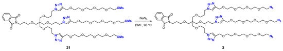 In a 100 mL round-bottom flask, crude trimesylate 21 (2.67 g) obtained in the previous step was dissolved in DMF (35 mL), and NaN3 (0.84 g, 12.9 mmol, 7.5 equiv.) was added. The reaction mixture was heated to 90 °C and stirred for 18 h. As TLC analysis (silica gel, EtOAc–MeOH, 2:1) indicated full conversion, the reaction mixture was cooled to 23 °C, and the DMF was removed on a rotary evaporator (bath temperature: 50 °C). The resultant light-brown oil was cooled to −18 °C (freezer) and triturated with THF (40 mL) at 23 °C. The resultant precipitate (sodium mesylate) was filtered out on Celite and washed with THF (60 mL). The THF solution was concentrated under reduced pressure to yield a light-brown oil, which was purified by flash column chromatography (silica gel, EtOAc–MeOH, 10:1→8:1→6:1→4:1→3:1) to afford triazide 3 (Scheme 6) as a colorless viscous oil (1.93 g, 83% over two steps). Rf 0.50 (silica gel, EtOAc–MeOH, 2:1). 1H NMR (700 MHz, DMSO-d6) δ 8.04 (s, 3H), 7.85–7.82 (m, 2H), 7.82–7.79 (m, 2H), 4.50 (s, 6H), 4.37 (t, J = 7.0 Hz, 6H), 3.64 (t, J = 6.9 Hz, 2H), 3.59 (app t, J = 5.0 Hz, 6H), 3.56–3.47 (m, 36H), 3.40 (t, J = 5.9 Hz, 2H), 3.37 (app t, J = 5.0 Hz, 6H), 3.30 (t, J = 6.0 Hz, 6H), 3.28 (s, 2H), 3.23 (s, 6H), 2.02 (p, J = 6.4 Hz, 6H), 1.83 (p, J = 6.4 Hz, 2H). 13C NMR (176 MHz, DMSO-d6) δ 167.8, 143.9, 134.2, 131.7, 123.7, 122.9, 69.76, 69.74, 69.72, 69.6 (two overlapping signals), 69.21, 69.17, 69.05, 68.9, 68.7, 67.3, 63.5, 49.9, 46.5, 44.8, 35.2, 29.7, 28.0. HRMS (ESI) calcd for C58H95N19O182+ [M+2H]2+ 672.8546, found 635.8575.