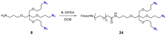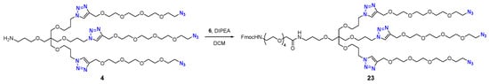In a 2 mL polypropylene microcentrifuge tube, amino triazide 4 (100 mg, 0.082 mmol, 1 equiv.) was dissolved in DCM (1 mL). DIPEA (21.5 µL, 16.0 mg, 0.123 mmol, 1.5 equiv.) was added, followed by a solution of FmocNH-PEG4-CH2CO2NSu 6 (70.5 mg, 0.123 mmol, 1.5 equiv) in DCM (0.2 mL). The reaction mixture was agitated on an orbital shaker at 23 °C for 1 h, after which TLC (silica gel, EtOAc–MeOH–Et3N, 1:1:0.1) showed complete consumption of 4. The reaction mixture was transferred to a round-bottom flask and concentrated under reduced pressure. The resultant residue was purified by flash column chromatography (silica gel, DCM–MeOH, 30:1→25:1) to afford triazide 23 (Scheme 8) as a colorless viscous oil (95 mg, 69%). Rf 0.48 (silica gel, DCM–MeOH, 9:1). 1H NMR (800 MHz, DMSO-d6) δ 8.04 (s, 3H), 7.88 (d, J = 7.5 Hz, 2H), 7.68 (d, J = 7.5 Hz, 2H), 7.58 (t, J = 5.9 Hz, 1H), 7.41 (t, J = 7.4 Hz, 2H), 7.32 (t, J = 7.4 Hz, 2H), 7.28 (t, J = 5.9 Hz, 1H), 4.51 (s, 6H), 4.38 (t, J = 7.0 Hz, 6H), 4.29 (d, J = 7.0 Hz, 2H), 4.20 (t, J = 7.0 Hz, 1H), 3.84 (s, 2H), 3.58 (app t, J = 7.0 Hz, 6H), 3.57–3.47 (m, 48H), 3.40 (t, J = 6.0 Hz, 2H), 3.37 (t, J = 4.9 Hz, 6H), 3.36 (m, 1H), 3.33 (t, J = 6.1 Hz, 6H), 3.29 (s, 8H), 3.15 (q, J = 6.6 Hz, 2H), 3.13 (q, J = 5.9 Hz, 1H), 2.04 (p, J = 6.5 Hz, 6H), 1.65 (p, J = 6.6 Hz, 2H). 13C NMR (201 MHz, DMSO-d6) δ 169.0, 156.1, 143.92, 143.87, 140.7, 127.5, 127.0, 125.1, 123.7, 120.0, 70.2, 69.9, 69.79, 69.77, 69.75, 69.71, 69.66, 69.54, 69.50, 69.2, 69.07, 69.03, 68.9, 68.7, 67.3, 65.3, 63.5, 50.0, 46.7, 46.6, 44.9, 40.1, 35.6, 29.8, 29.3. HRMS (ESI) calcd for C75H122N20O232+ [M+2H]2+ 835.4490, found 835.4506.