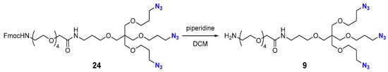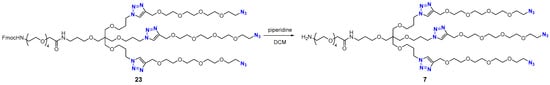 In a 10 mL round-bottom flask, triazide 23 (59.6 mg, 0.036 mmol, 1 equiv.) was dissolved in DCM (2 mL), and piperidine (0.4 mL) was added. The reaction mixture was stirred at 23 °C for 2 h and concentrated under reduced pressure. The resultant white solid residue was coevaporated with DCM (3 × 5 mL) and purified by flash column chromatography (silica gel, DCM–MeOH, 1:0→10:1) to afford amino triazide 7 (Scheme 9) as a colorless viscous oil (21 mg, 50%). Rf 0.43 (silica gel, EtOAc–MeOH–Et3N, 1:1:0.1). 1H NMR (800 MHz, DMSO-d6) δ 8.23 (br s, 2H), 8.06 (s, 3H), 7.67 (t, J = 5.8 Hz, 1H), 4.51 (s, 6H), 4.39 (t, J = 7.1 Hz, 6H), 3.86 (s, 2H), 3.60 (m, 2H), 3.59 (app t, J = 5.0 Hz, 6H), 3.57–3.48 (m, 48H), 3.374 (t, J = 5.0 Hz, 6H), 3.367 (t, J = 6.6 Hz, 2H), 3.34 (t, J = 6.0 Hz, 6H), 3.30 (s, 8H), 3.15 (q, J = 6.6 Hz, 2H), 2.95 (t, J = 5.3 Hz, 2H), 2.04 (p, J = 6.4 Hz, 6H), 1.65 (p, J = 6.6 Hz, 2H). 13C NMR (201 MHz, DMSO-d6) δ 169.0, 143.9, 123.7, 70.1, 69.9, 69.78, 69.76, 69.74, 69.68, 69.65, 69.58, 69.55, 69.52, 69.20, 69.08, 69.05, 68.93, 68.7, 67.4, 66.8, 63.5, 50.0, 46.6, 44.9, 38.6, 35.7, 29.8, 29.2. HRMS (ESI) calcd for C60H112N20O212+ [M+2H]2+ 724.4150, found 724.4182.