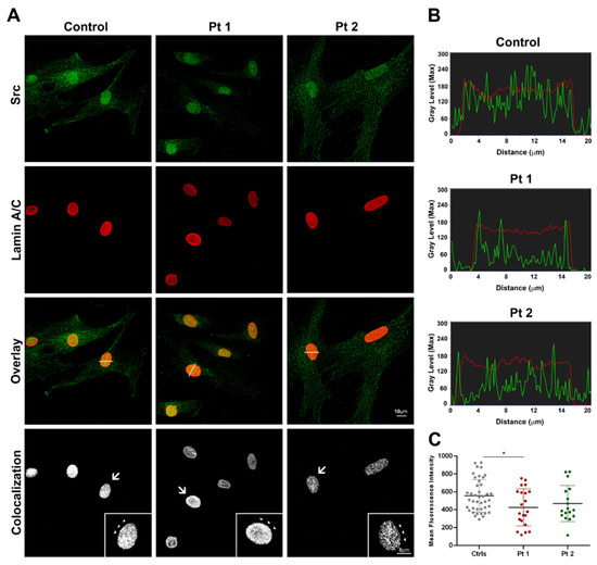 Confocal microscopy imaging of Src (in green) and lamin A/C (in red) in control and laminopathic fibroblasts. (A) Src immunofluorescence showed a punctate and diffuse distribution in the nuclear and cytoplasmic compartments, with a higher concentration in the nuclei, both in healthy cells and patients’ cells. Orange pixels showed the overlay of Src and Lamin A/C fluorescence in doubled-stained cells. Colocalization masks of double-stained cells (white pixels) showed the Src-lamin A/C co-distribution both at the nuclear envelope (arrows and arrowheads) and in the nucleoplasm. (B) Intensity line profiles of Src (green) and lamin A/C (red) across the focal central plane, as indicated by the white dotted line of representative nuclei in the overlay images. Scale bars: 10 μm for all images except insets (5 μm). (C) Src mean fluorescence intensity decreased in patients’ nuclei, significantly in Pt 1, compared to controls (* p < 0.05).
