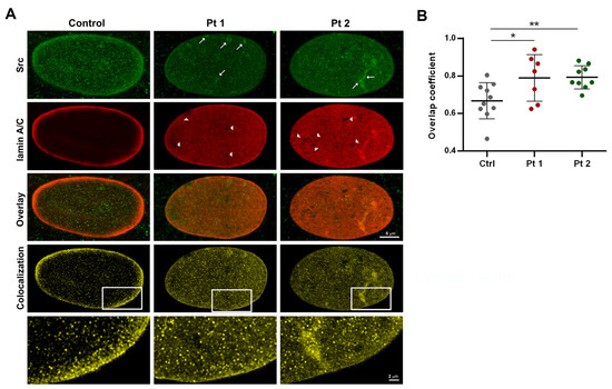 By STED imaging, we observed a fine punctate and diffuse distribution of Src protein inside healthy nuclei, with a higher signal intensity at the periphery, where the lamin A/C signal was concentrated (Figure 2A). In laminopathic nuclei, Src localization was comparable to that of controls, although with a more reduced intensity, especially at the nuclear rim; furthermore, some anomalous Src aggregates or clusters were noticed (Figure 2A). Lamin A/C labeling was particularly concentrated at the periphery of healthy nuclei, as expected; in laminopathic cells, a wide lamin A/C distribution in the nuclear matrix and abnormalities in the microfilamentous meshwork texture were noticed in several nuclei (Figure 2A). Super-resolved Src-lamin A/C colocalization masks highlighted a higher degree of overlap in Pt 1 (OC: 0.789 ± 0.04; *: p < 0.05) and Pt 2 (0.793 ± 0.02; **: p < 0.01) nuclei compared to the controls (0.668 ± 0.03; Figure 2A,B).