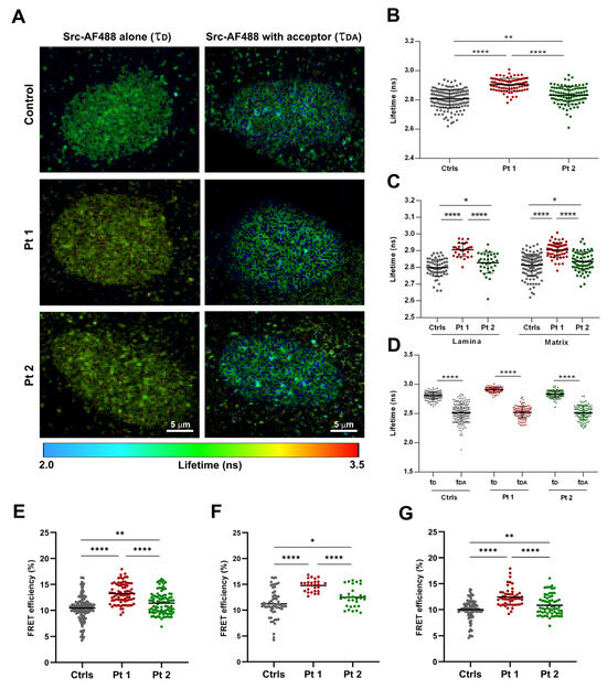 In double stained samples, in the presence of lamin A/C-AF594 acceptor, the lifetime of the Src-AF488 donor (amplitude weighted lifetime, τDA) reduced significantly in controls and patients’ nuclei (p < 0.0001; Figure 3D), with a greater decrease in Pt 1 (p < 0.0001) and to a lesser extent, in Pt 2 (p < 0.0001), as confirmed by the calculated FRET efficiencies (Figure 3E–G). The rate of energy transfer (E) in total ROIs was greater in Pt 1 (13.25 ± 0.22) compared to Pt 2 (11.39 ± 0.22), and both of them were significantly different from the control mean value (10.45 ± 0.18, p < 0.0001 vs. Pt 1; p < 0.01 vs. Pt 2; Figure 3E; Table S2). In all samples, a higher value of interaction between Src and lamin A/C was observed at the level of the nuclear rim (Figure 3F) compared to the nucleoplasm (Figure 3G). By measuring the donor lifetime in the presence and the absence of the acceptor, we calculated the distance (RDA) between the donor-AF488 and acceptor-AF594 labeled proteins. The higher transfer efficiencies detected in patients’ nuclei, particularly in Pt 1 (Figure S1) were indicative of a shorter RDA between the chromophores engaged in FRET (Table S3). Furthermore, a reduced RDA between Src and lamin A/C was observed at the nuclear periphery compared to the nucleoplasm in Pt 1 (p < 0.0001) and Pt 2 (p < 0.001), whereas in healthy cells, no differences were observed (Table S3).