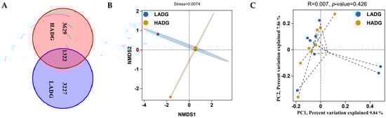Analysis of the microbiota diversity of the jejuna of HADG and LADG lambs. (A) ASV Venn diagram analysis of HADG and LADG lambs. (B) PCoA analysis of HADG and LADG lambs. (C) NMDS analysis of HADG and LADG lambs.