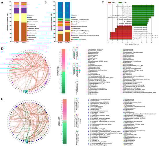 Additionally, the linear discriminant analysis (LDA = 3.0) effect size (LEfSe) of lamb jejunal biomarkers identified 18 significant biomarkers, of which 11 were found in LADG lambs and 7 in HADG lambs. At the genus level, LADG lambs were identified by two biomarkers: Christensenellaceae_R_7_group and Coprococcus. Meanwhile, the two identified biomarkers in HADG lambs were Erysipelotrichaceae_UCG_009 and unclassified_[Eubacterium]_coprostanoligenes_group (Figure 2C). Moreover, the analysis of the top 80 genus level network diagrams depicting the microbial network in the jejuna of lambs from the LADG and HADG groups indicated significant correlations among the microbiota (p < 0.05) (Figure 2D,E). Notably, the jejunal microbial interactions were dominated by Firmicutes in both the LADG and HADG groups (Figure 2D,E).