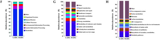 Finally, Phylogenetic Investigation of Communities by Reconstruction of Unobserved States (PICRUSt2) prediction results of the LADG and HADG groups showed that the main enrichment was in the metabolic pathway and accounted for more than 78.54% and 78.40%, respectively, including the top 10 class 2 level global and overview maps (LADG: 43.36%; HADG: 43.25%), carbohydrate metabolism (LADG: 9.10%; HADG: 9.11%), amino acid metabolism (LADG: 6.79%; HADG: 6.72), metabolism of cofactors and vitamins (LADG: 4.30%; HADG: 4.27), energy metabolism (LADG: 4.17%; HADG: 4.17%), and nucleotide metabolism (LADG: 3.87%; HADG: 3.86%) (Figure 2F,G). However, HADG and LADG lamb jejunal microbiota were not significantly affected in the top 10 functional enrichment at the class 1 (Figure 2F), class 2 (Figure 2G), and class 3 levels (Figure 2H) (p > 0.05).
