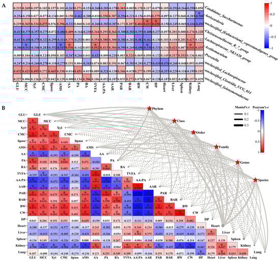 Figure 3 analyzes the correlation between the host phenotype and top 10 jejunal microbiota at the genus level (A) and for microbiota (B). Mantel’s r analysis revealed that jejunal microbiota had no significant jejunal digestive enzymes (GLU, MCC, Xyl, CMC, lipase, and AMS), VFA molar content (AA, PA, BA, and TVFAs), VFA molar ratio (AA:PA, AAR, PAR, and BAR), dressing percentage (BW, CW, and DP), and organ index effect (heart, liver, spleen, kidney, and lung indices) (p > 0.05) (Figure 3B). Furthermore, the jejunal digestive enzymes GLU, MCC, Xyl, CMC, lipase, and AMS were significantly positively correlated with each other (Figure 3B) (p < 0.05). Meanwhile, Acetitomaculum was significantly negative correlated with MCC and AMS (p < 0.05) (Figure 3A,B). Additionally, there was a significant positive correlation between AA and TVFAs as well as BA and PA in the jejunum (p < 0.05), while Acetitomaculum was significantly positively correlated with TVFAs (p < 0.05) (Figure 3A,B). Moreover, AA had a significant positive correlation between AA:PA and AAR, but they were all significantly negatively correlated with PAR and BAR (p < 0.05) (Figure 3B). Meanwhile, there was a significant positive correlation between AA:PA and AAR as well as PAR and BAR (p < 0.05) (Figure 3B). Additionally, CW was significantly correlated with Acetitomaculum (R = −0.530) and unclassified_[Eubacterium]_coprostanoligenes_group (R = 0.611) (p < 0.05) (Figure 3A). In addition, significant correlations were found between Acetitomaculum and the kidney index (R = 0.541), unclassified_[Eubacterium]_coprostanoligenes_group and DP (R = 0.650), and Aeriscardovia and the lung (R = −0.50) (p < 0.05) (Figure 3A). However, the kidney was significantly negatively correlated with GLU, MCC, Xyl, CMC, lipase, AMS, PAR, BW, and CC (p < 0.05), but it was significantly positively correlated with AA, TVFAs, AA:PA, and AAR (p < 0.05) (Figure 3B). Moreover, the liver showed a significant positive correlation with the heart, lung, and kidney (p < 0.05), while DP and the lung had a significant negative correlation (p < 0.05) (Figure 3B). Notably, BW and CW were significantly positively correlated with GLU, MCC, Xyl, CMC, AMS, PA, BA, PAR, and BAR (p < 0.05), but they demonstrated significant negative correlations with AA, TVFAs, AA:PA, and AA (p < 0.05) (Figure 3B).