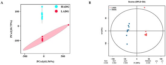 It can be seen from PCoA (Figure 4A) and orthogonal projections to latent structure discriminate analysis (OPLS-DA) (Figure 4B) that the samples of each group were distinguishable. In this case, the model is reliable (Q2Y = 0.959 > 0.50) and can be used to screen for differential metabolites. Next, volcano plots were created according to VIP > 1 and p < 0.05, in which 4982 metabolites were identified, containing 1909 (1302 up-regulated and 607 down-regulated) differential metabolites (Figure 4C).