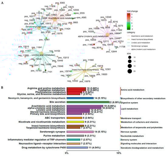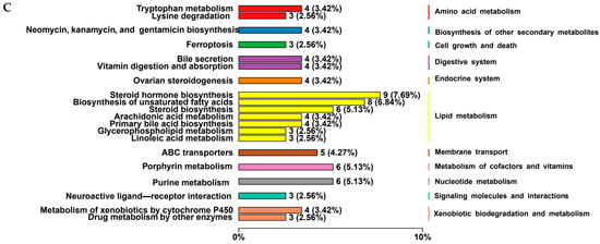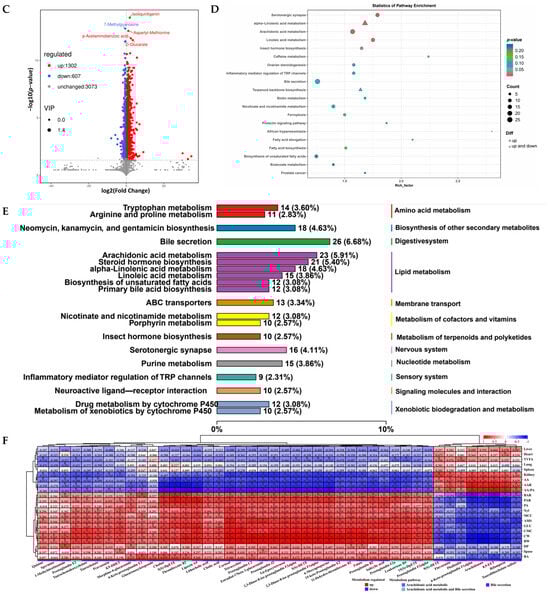 Furthermore, liver differential metabolites were annotated using the Kyoto Encyclopedia of Genes and Genomes (KEGG) database, and the top 20 pathways with the highest number of selected metabolites are shown in Figure 4D,E, including amino acid metabolism (tryptophan metabolism and arginine and proline metabolisms), biosynthesis of other secondary metabolites (neomycin, kanamycin, and gentamicin biosynthesis), digestive system (bile secretion), lipid metabolism (arachidonic acid metabolism, steroid hormone biosynthesis, alpha-Linolenic acid metabolism, linoleic acid metabolism, biosynthesis of unsaturated fatty acids, and primary bile acid biosynthesis), membrane transport (ABC transporters), metabolism of cofactors and vitamins (nicotinate and nicotinamide metabolisms and porphyrin metabolism), metabolism of terpenoids and polyketide (insect hormone biosynthesis), nervous system (serotonergic synapse), nucleotide metabolism (purine), sensory system (inflammatory mediator regulation of TRP channels), signaling molecules and interaction (neuroactive ligand–receptor interaction), and xenobiotics biodegradation and metabolism (metabolism of xenobiotics by cytochrome P450 and drug metabolism via cytochrome P450). In addition, the two most abundant pathways for liver differential metabolite enrichment were bile secretion and arachidonic acid metabolism (Figure 4E).
