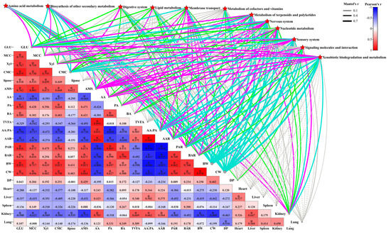 The results of plotting correlation chord plots and network diagrams by keeping the correlation results of the top 30 frequencies of differential metabolites/differential microbiota (|CC| > 0.8 and CCP < 0.05) containing at least one set of correlation coefficients with an absolute value in the top 30 showed that Candidatus_Actinomarina, Candidatus_Puniceispirillum, Christensenellaceae_R_7_group, Clostridium_sensu_stricto_8, Garicola, Ochrobactrum, Pseudoalteromonas, unclassified_AEGEAN_169_marine_group, and Licoagrodin were positively correlated, but they were negatively correlated with all other metabolites (such as valeroyl salicylate, C20912, hexadecanedioate, diamsar chelate, guanosine monophosphate, dTDP-L-epivancosamine, methylitaconate, p-Tolyl Sulfate, butanamide, etc.) (Supplementary Figures S6 and S7). Notably, Mantel’s r analysis showed that the liver KEGG enrichment pathway was significantly correlated with lamb jejunal digestive enzymes (GLU, MCC, Xyl, CMC, and AMS), VFA molar content (AA, PA, and BA), VFA molar ratio (AA:PA, AAR, PAR, and BAR), dressing percentage (BW, CW, and DP), and organ indices (kidney index) but not significantly correlated with lipase, TVFAs, the heart index, liver index, spleen index, and lung index (p < 0.05) (Figure 6).