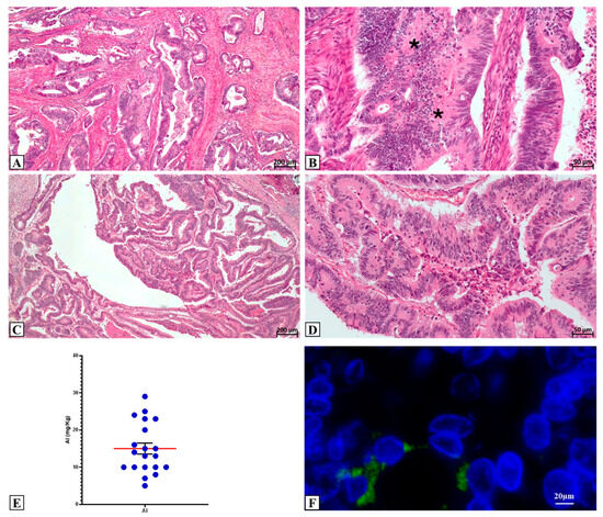 Figure 1. Histological analysis and aluminum detection. (A) Hematoxylin and eosin staining shows a colorectal adenocarcinoma with high inflammatory infiltrate. (B) High magnification of panel (A) displays numerous inflammatory cells (asterisk) next to cancerous ones. (C) Hematoxylin and eosin staining shows a colorectal adenocarcinoma. (D) High magnification of panel (C). (E) Aluminum concentration detected by ICP-MS analysis. (F) Colon cancer cells with aluminum (green; morin staining) in the cytoplasm. Red line represents the mean value.