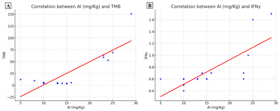 Figure 2. Effect of aluminum concentration on Tumoral mutational burden (TMB) and IFNγ. (A) Graph shows a positive association between aluminum concentration and TMB values. (B) Graph displays a positive association between aluminum concentration and IFNγ expression.