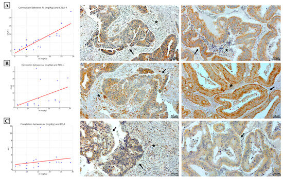Figure 3. Effect of aluminum concentration on the expression of immune checkpoints. (A) Positive association between aluminum concentration and CTLA-4 expression (RNASeq). Immunohistochemistry shows CTLA-4 expression in both cancer cells (arrow) and inflammatory cells (asterisk). (B) Graph displays a positive trend between aluminum concentration and PD-L1 expression (RNASeq). Immunohistochemistry shows PD-L1 expression in both cancer cells (arrow) and inflammatory cells (asterisk). (C) Graph displays a positive trend between aluminum concentration and PD-1 expression (RNASeq). Immunohistochemistry shows PD-1 expression in both cancer cells (arrows) and inflammatory cells (asterisk).