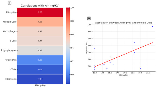 Figure 4. Association between aluminum concentration and immune cell types. (A) The heatmap reports the Pearson correlation values for the association between aluminum and the immune cell types. (B) Graph shows a positive association between aluminum concentration and myeloid cells.