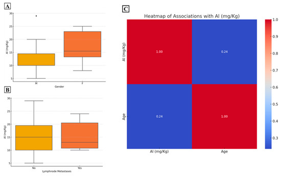 Figure 5. Association between aluminum concentration and categorical and continuous variables. (A) Graph shows the different aluminum concentration in male and female groups. (B) Graph displays the aluminum concentration in patients without and with lymph node metastasis at the time of surgery. (C) The heatmap reports the Pearson correlation values for the association between aluminum and age.