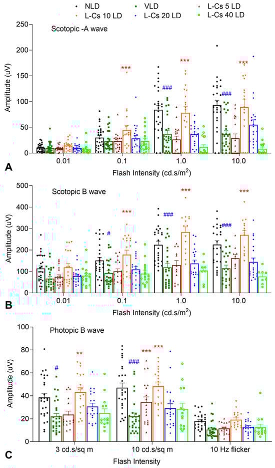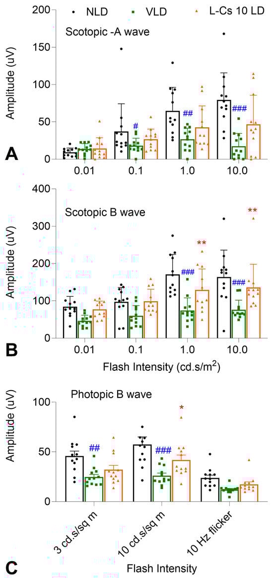 L-Cycloserine protects mouse retina from LIRD. ERG analysis shows Scotopic a-wave (A), b-wave (B), and Photopic b-wave (C) from NLD: no light-damaged control group; VLD: vehicle-injected light-damaged group; L-Cs 10 LD: L-Cycloserine-treated (10 mg/kg) light-damaged group. (n = 6/group; values are mean ± SEM; * represents significance between VLD and L-Cs 10 LD; * p < 0.05, ** p < 0.01, by the student t test; # represents significance between NLD and VLD; # p < 0.05, ## p < 0.01, ### p < 0.001, by the student t test).