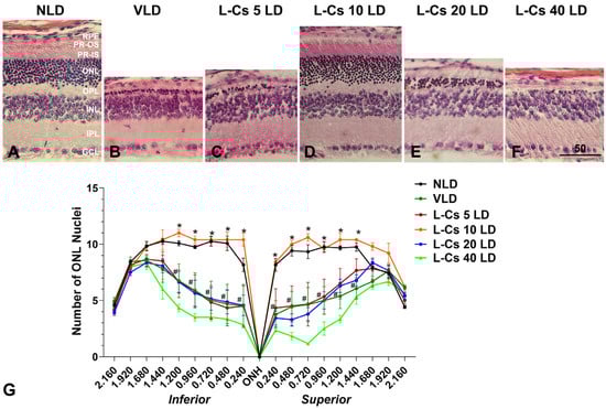 Representative H&E-stained sections of the retina 7 days after light damage were examined (Figure 3A–F). By 7 days, the dead photoreceptors are cleared by macrophages, and the remaining nuclei in the Outer Nuclear Layer (ONL) represent the surviving photoreceptors. The VLD group displayed significant photoreceptor loss (number of nuclei in the ONL), particularly in the central retina (Figure 3B), revealing damage induced by light as expected. Treatment with L-Cycloserine at a dose of 10 mg/kg (L-Cs 10 LD, Figure 3D) provided significant protection from light-induced photoreceptor cell death since the number of nuclei in the ONL displayed is very close to NLD (Figure 3A). By quantitative morphometry, the number of ONL nuclei in the entire retina was counted from the superior to inferior end through the vertical meridian, and values were plotted as a spider graph (Figure 3G). NLD displays an ONL thickness as expected of mice with normal vision. VLD reveals photoreceptor degeneration (greater than 50% damage) induced by light with a significantly reduced number of ONL nuclei. L-Cs 10 LD demonstrated the maximum preservation of photoreceptors compared to other doses, showing the number of ONL nuclei very similar to NLD and demonstrating a significant difference from the VLD group (Figure 3G). Doses of 5 and 20 mg/kg (L-Cs 5 LD and L-Cs 20 LD) showed no significant difference in number of ONL nuclei compared to VLD, while the 40 mg/kg dose (L-Cs 40 LD) failed to protect photoreceptors from light-induced degeneration, exhibiting a significantly reduced number of ONL nuclei compared to VLD (Figure 3G).