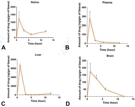 Pharmacokinetic profile of L-Cycloserine in plasma and various tissues. L-cycloserine was intraperitoneally injected at a dose of 20 mg/kg and quantified using LC-MS/MS in retina (A), plasma (B), liver (C), and brain (D) at various time points after administration. The results are expressed as a mean ± SEM (n = 7 for each time point).