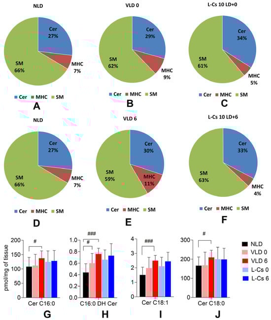 Subsequent evaluation of L-Cycloserine-induced protection of BALB/c mice retinal photoreceptors from light-induced degeneration involved a detailed sphingolipid analysis immediately after light damage (LD + 0) and 6 h after light damage (LD + 6) (Figure 5). The 10 mg/kg dose of L-Cycloserine was chosen as it offered the maximum protection against light-induced degeneration in previous experiments. The results demonstrate an increase in the relative combined percentage of ceramide and MHC upon light exposure, which supports our hypothesis, indicating ceramide upregulation induced by light damage (Figure 5A,B,D,E). Excessive bioactive ceramide, beyond the normal homeostatic levels, undergoes conversion to non-bioactive MHC by adding sugar to the ceramide backbone []. Ceramides destined for conversion to MHCs usually reach the Golgi via vesicular transport, followed by the addition of sugar moieties to very long-chain ceramides, catalyzed by glycosyl-transferases at the cytosolic surface of the Golgi []. The results also demonstrate that the relative combined percentage of ceramide and MHC continues to increase with time, as seen in VLD 0 vs. VLD 6 data (Figure 5B,E), indicating ongoing induction of ceramide biosynthesis for up to 6 h in agreement with our previous study []. Time-dependent progressive sphingolipid analysis for 24 h after light damage in the future can further delineate how ceramide level changes with time in the BALB/c mice LIRD model.