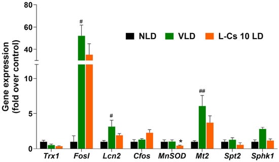 The expression of a series of genes related to the antioxidant, apoptotic, and sphingolipid pathways was investigated immediately after light damage in all three groups of mice: control no light-damaged (NLD); vehicle-injected light-damaged (VLD); and L-Cycloserine-injected (L-Cs 10 LD) light-damaged group, using qRT–PCR (Figure 6). Compared to control NLD, the light-damaged group (VLD) exhibited a significant alteration in the expression of Fosl (Figure 6, 52.17-fold increase, p < 0.05), Lcn2 (Figure 6, 3.15-fold increase, p < 0.05) and Mt2 (Figure 6, 6.08-fold increase, p < 0.01). Treatment with L-Cycloserine (L-Cs 10 LD) demonstrates a trend to lower the expression of these genes compared to VLD (Figure 6). L-Cs 10 LD treatment particularly alters MnSOD significantly (Figure 6, 2.34-fold decrease, p < 0.05) when compared to VLD. This specific downregulation of MnSOD suggests a potential mechanism of action or cellular adaptation that warrants further investigation.