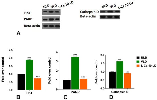 The expression of specific proteins involved in cellular antioxidant and cell death pathways was also assessed immediately after light damage in all three groups of mice: control no light-damaged (NLD); vehicle-injected light-damaged (VLD) and L-Cycloserine-injected (L-Cs 10 LD) light-damaged group. Western blot analysis was performed to evaluate protein expression, and subsequent quantification was carried out through densitometric analysis (Figure 7). Light damage causes a significant upregulation in all three proteins investigated: heme oxygenase 1 (Ho1) (Figure 7B, 1.89-fold, p < 0.001), Poly(ADP-ribose) polymerase (PARP) (Figure 7C, 3.45-fold, p < 0.001), and Cathepsin D (Figure 7D, 1.62-fold, p < 0.001). However, treatment with L-Cycloserine (L-Cs 10 LD) causes the expression of all three proteins to be significantly reduced (p < 0.001, Figure 7B, C, and D, respectively).