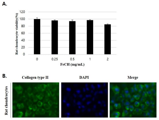 The survival rate of primary rat chondrocytes (RC) in response to FeCH was analyzed using MTT assay. Cells were seeded at 1.5 × 106 RC per well in a 12-well cell culture dish and cultured overnight. Then, 0.25, 0.5, 1, and 2 mg/mL FeCH were allowed to react for 24 h. After the reaction, 100 µL of MTT (5 mg/mL) solution was added, and the mixture was allowed to react at 37 °C, 5% CO2, and incubated for 2 h. After the reaction, the culture medium was removed, formazan salt was dissolved in DMSO, and cell viability was measured at 590 nm using an ELISA reader (Epoch; BioTek Instruments, Winooski, VT, USA). The absorbance of the control group was set at 100%, and the absorbance of the experimental group treated with the sample was expressed as a percentage (%) compared with that of the control group.